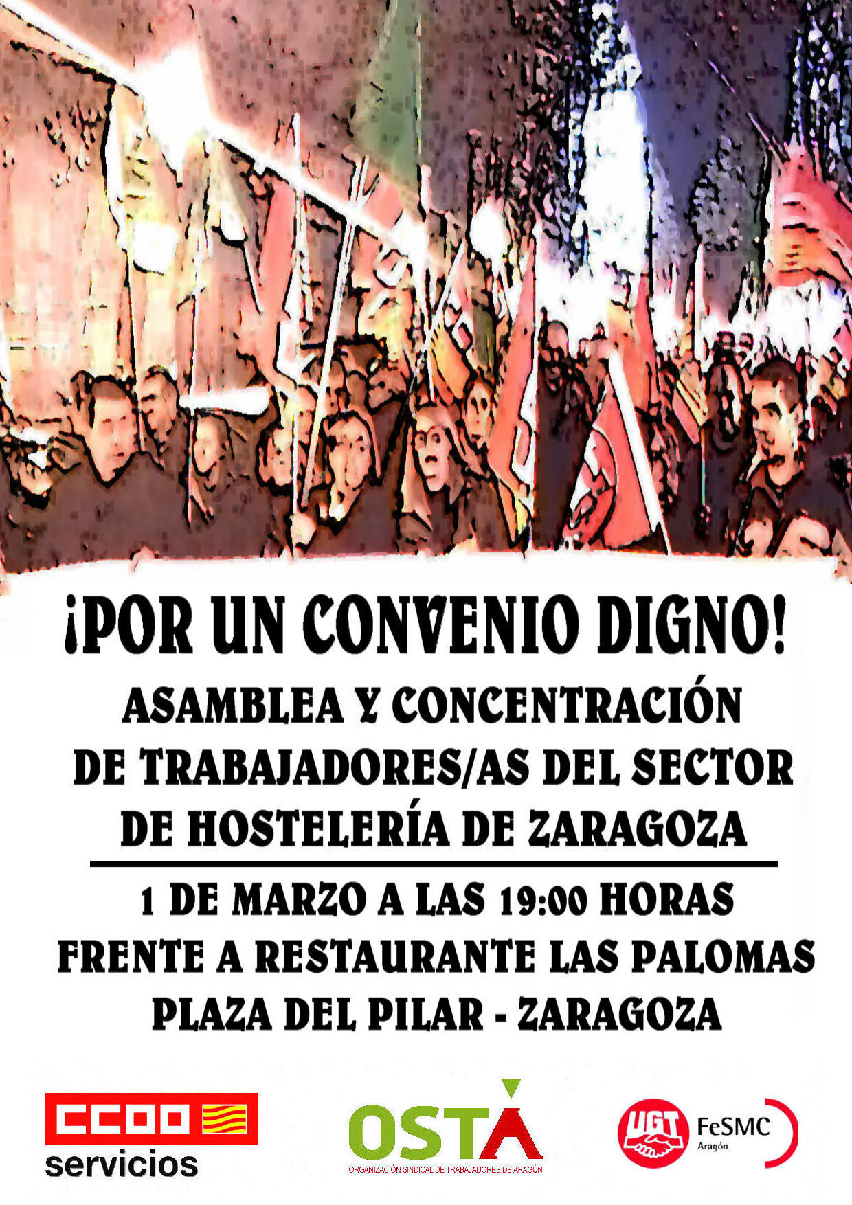 Es el momento de decir ¡BASTA! Defiende un convenio digno y acude a la asamblea y concentración el día 1 de marzo a las 19 horas frente al Restaurante Las Palomas en Plaza del Pilar.