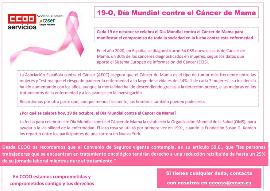 Cada 19 de octubre se celebra el Día Mundial contra el Cáncer de Mama para manifestar el compromiso de toda la sociedad en la lucha contra esta enfermedad.