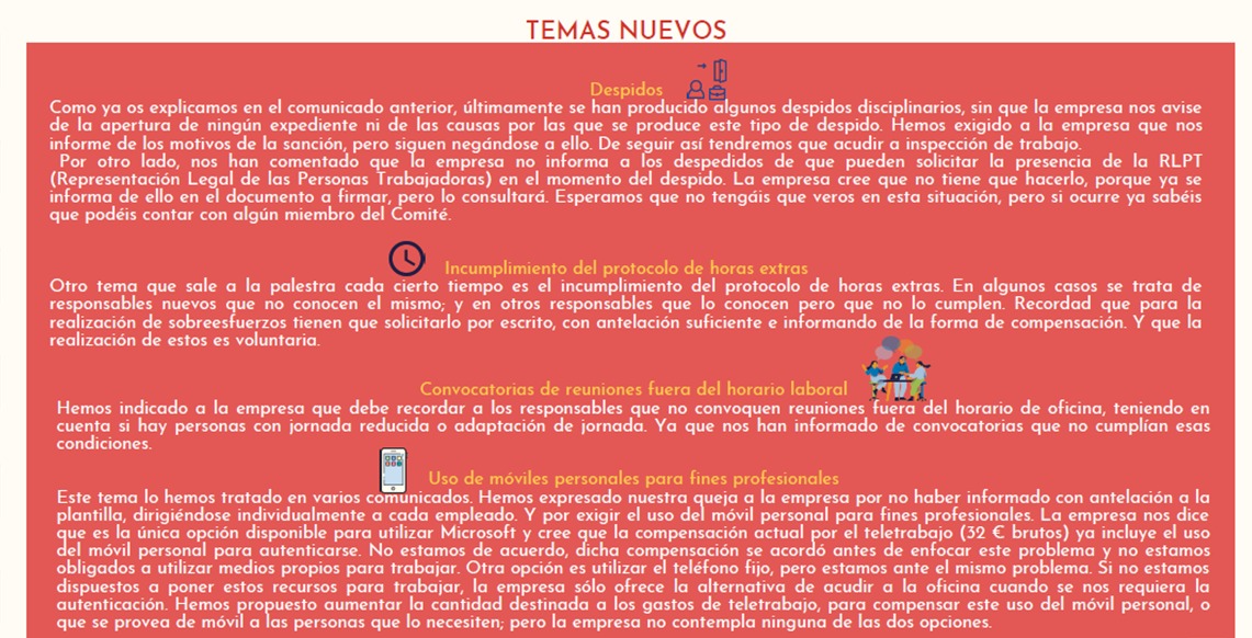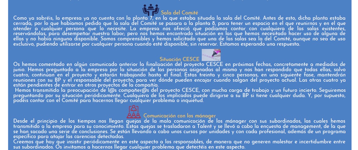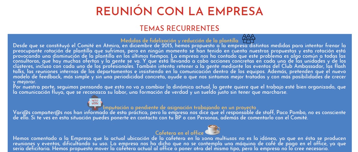 El pasado 17 de marzo tuvo lugar la 1ª reunión trimestral del año entre el Comité y la Empresa. En el presente comunicado haremos un resumen de lo más importante que se trató en la misma, para vuestro conocimiento.