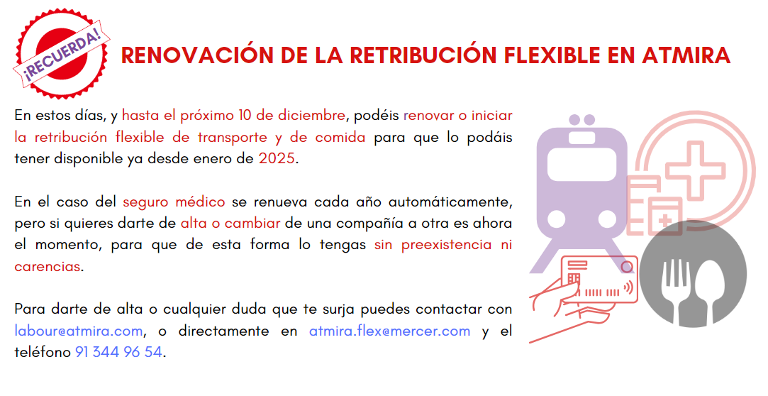 – Ahora es el momento de renovar la retribución flexible de transporte y comida, o en caso de que quieras iniciar el seguro médico, ya que de esta forma éste será sin preexistencia ni carencia.