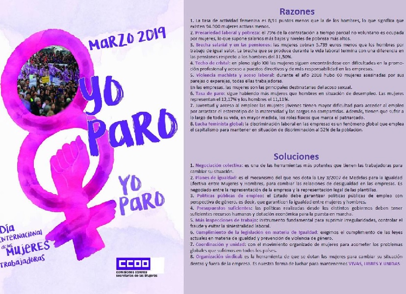 Las delegadas y delegados de CCOO de Caser, involucrados e involucradas con esta lucha, hicimos un llamamiento a la plantilla, con el lema "YO PARO", para secundar la convocatoria de paros laborales y para participar en los distintos actos, manifestaciones y movilizaciones que se celebraron con motivo del 8 de marzo, para reiterar nuestro compromiso activo con la eliminación de la discriminación laboral, económica y social de las mujeres.