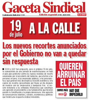 CCOO y UGT han propuesto, para el próximo 19 de julio, la convocatoria de una jornada de manifestaciones en todo el país para protestar contra las nuevas medidas de recorte anunciadas por el presidente del Gobierno, que afectan a las personas en paro, a los empleados públicos, a los pensionistas y que generan más desempleo y recesión económica.