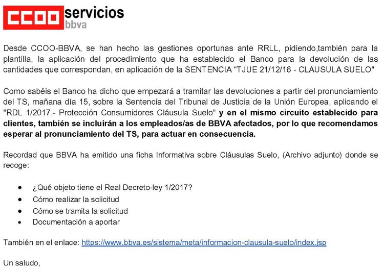 A la afiliación de CCOO en BBVA: Cláusula Suelo TRABAJADORES/AS BBVA