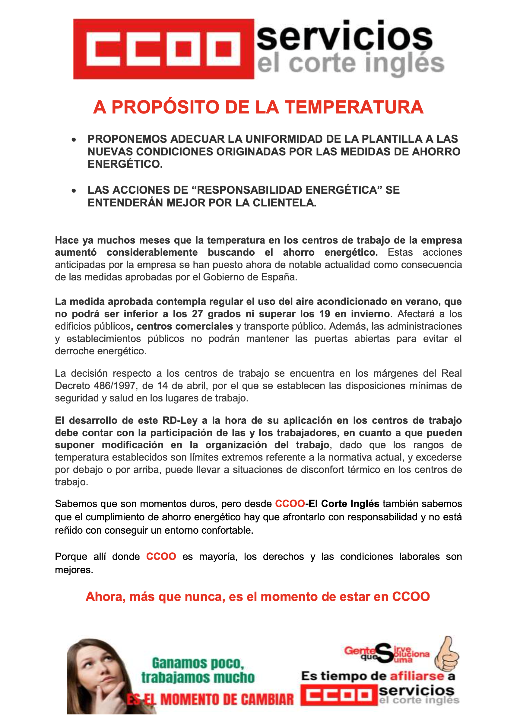 Proponemos adecuar el uniforme de la plantilla a las nuevas condiciones originadas por las medidas de ahorro energético.