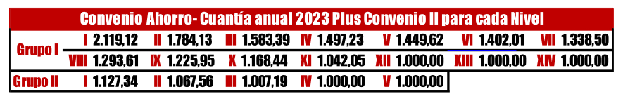 Conseguimos añadir al 1% de subida salarial ya pactado un Plus Mejora Convenio de cuantía fija = 4,25% de 18,5 pagas salario base para cada nivel de convenio, con mínimo de 1.000€.