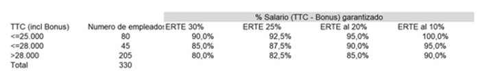 - Se acuerda garantizar que ningún trabajador como consecuencia de la aplicación del ERTE, tendrá unos ingresos inferiores al 80% de su salario, incrementándose hasta el 90% en rentas menores a 25.000 euros (en su aplicación máxima del 30%, incrementándose dicha garantía a medida que se reduce el %), de acuerdo con el siguiente esquema, que se plantea para distintos escenarios de reducción de jornada: