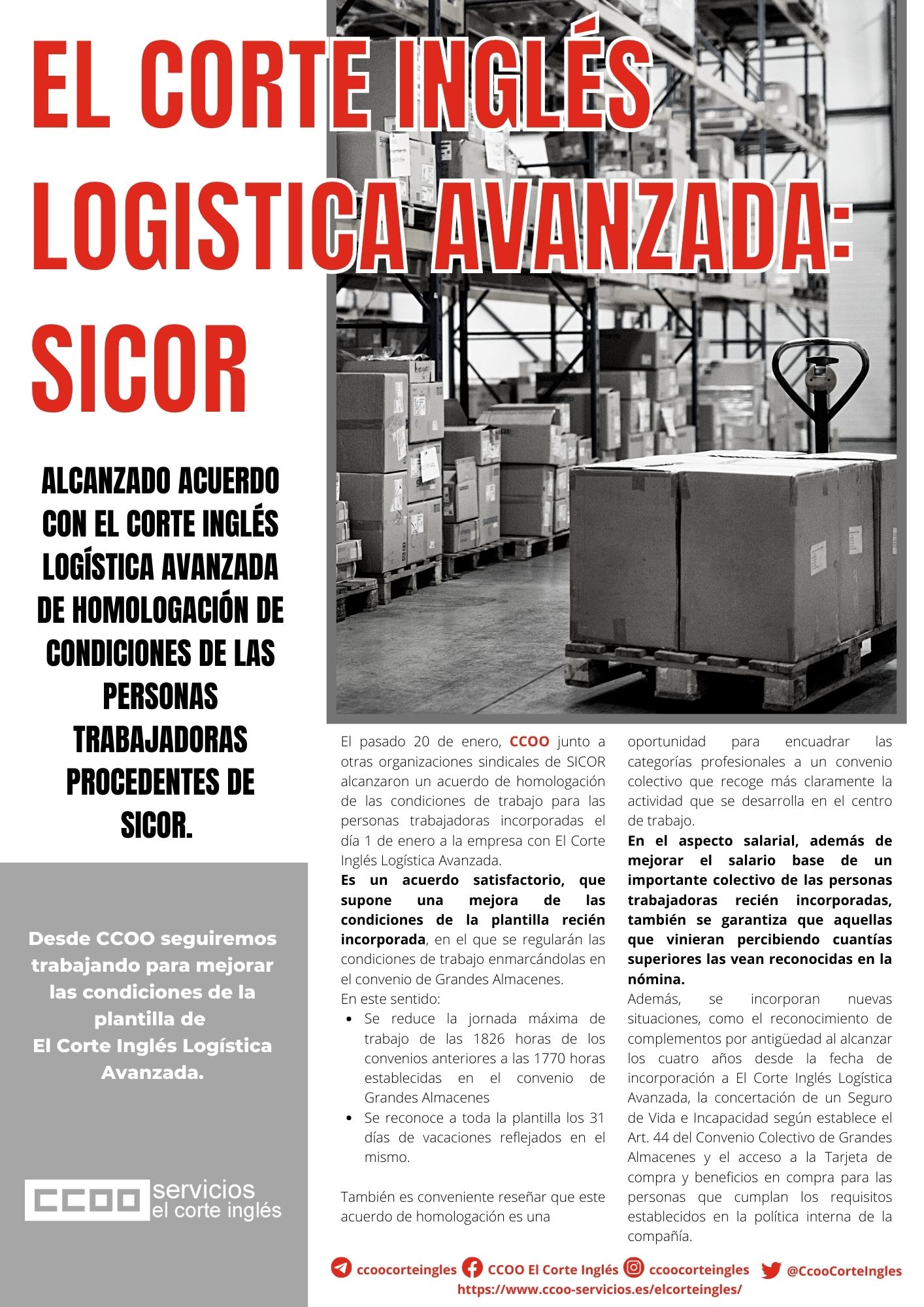El pasado 20 de enero, CCOO junto a otras organizaciones sindicales de SICOR alcanzaron un acuerdo de homologación de las condiciones de trabajo para las personas trabajadoras incorporadas el día 1 de enero a la empresa con El Corte Inglés Logística Avanzada.
