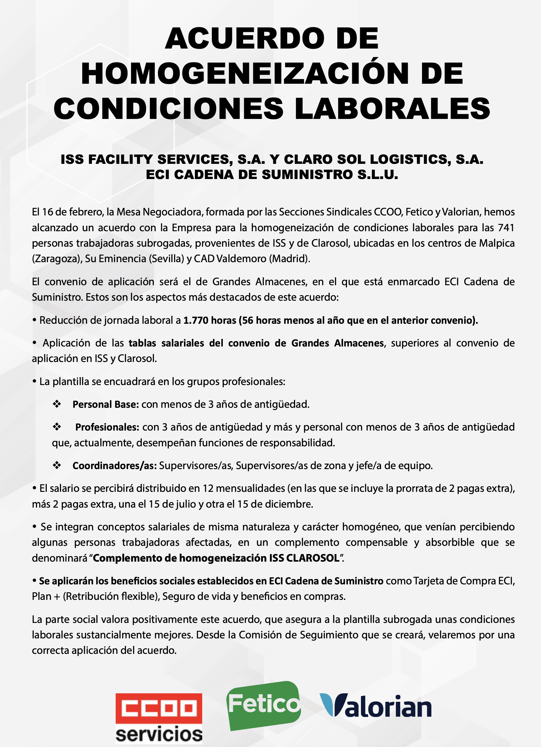 Valoramos positivamente este acuerdo que mejora sustancialmente las condiciones laborales de la plantilla subrogada.