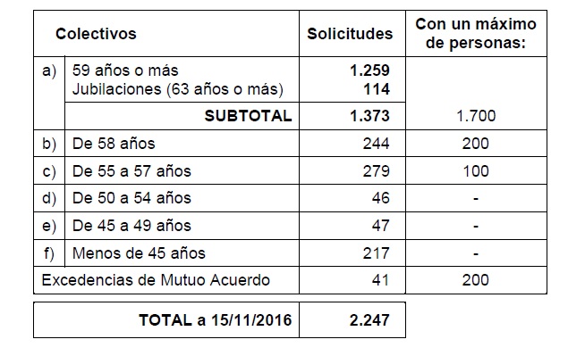 | Del colectivo a) hay 1.373 personas que han solicitado voluntariamente la extinción de su contrato, incluyendo jubilaciones, del total de las 1.700 que el banco considera dentro de sus planteamientos. Por tanto, faltarían unas 327 personas de este colectivo que pueden solicitar voluntariamente la medida antes del fin del plazo previsto (diez días naturales contados a partir del día 9 de noviembre de 2016) y, en consecuencia, evitar la posibilidad del despido forzoso y la pérdida de los 3.000 euros de la prima de voluntariedad. |