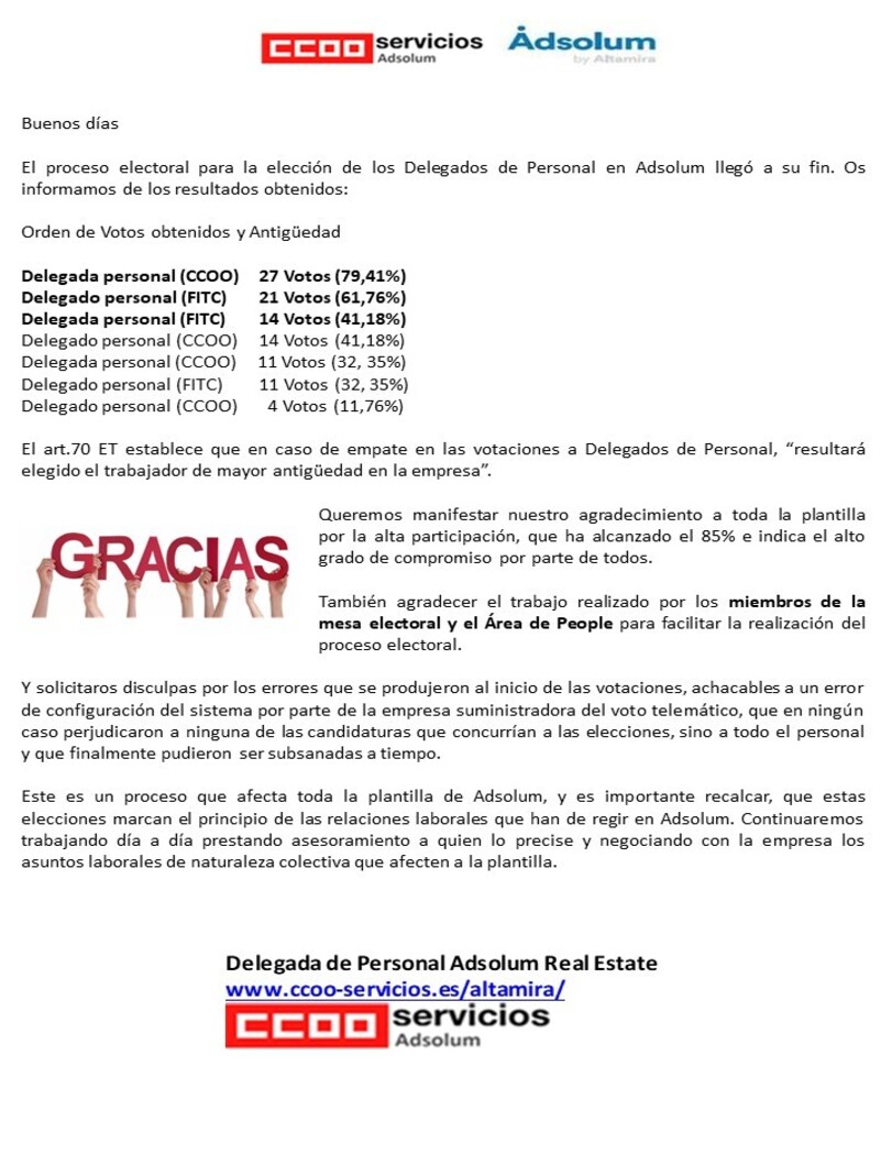 Tras la celebración de las primeras elecciones sindicales en Adsolum a Delegado/as de Personal CCOO Adsolum ha obtenido una delegada de personal.