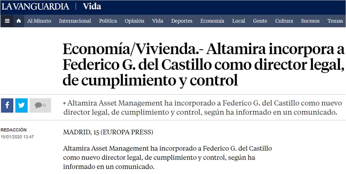 La Vanguardia – Altamira incorpora a Federico G. del Castillo como director legal, de cumplimiento y control