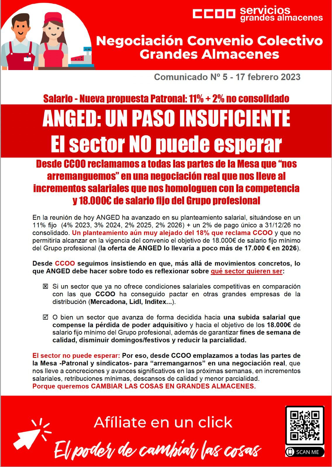 Nueva propuesta salarial de ANGED –> 11% (4% 2023, 3% 2024, 2% 2025, 2% 2026)  +2% en un pago único no consolidable al final de la vigencia del convenio.