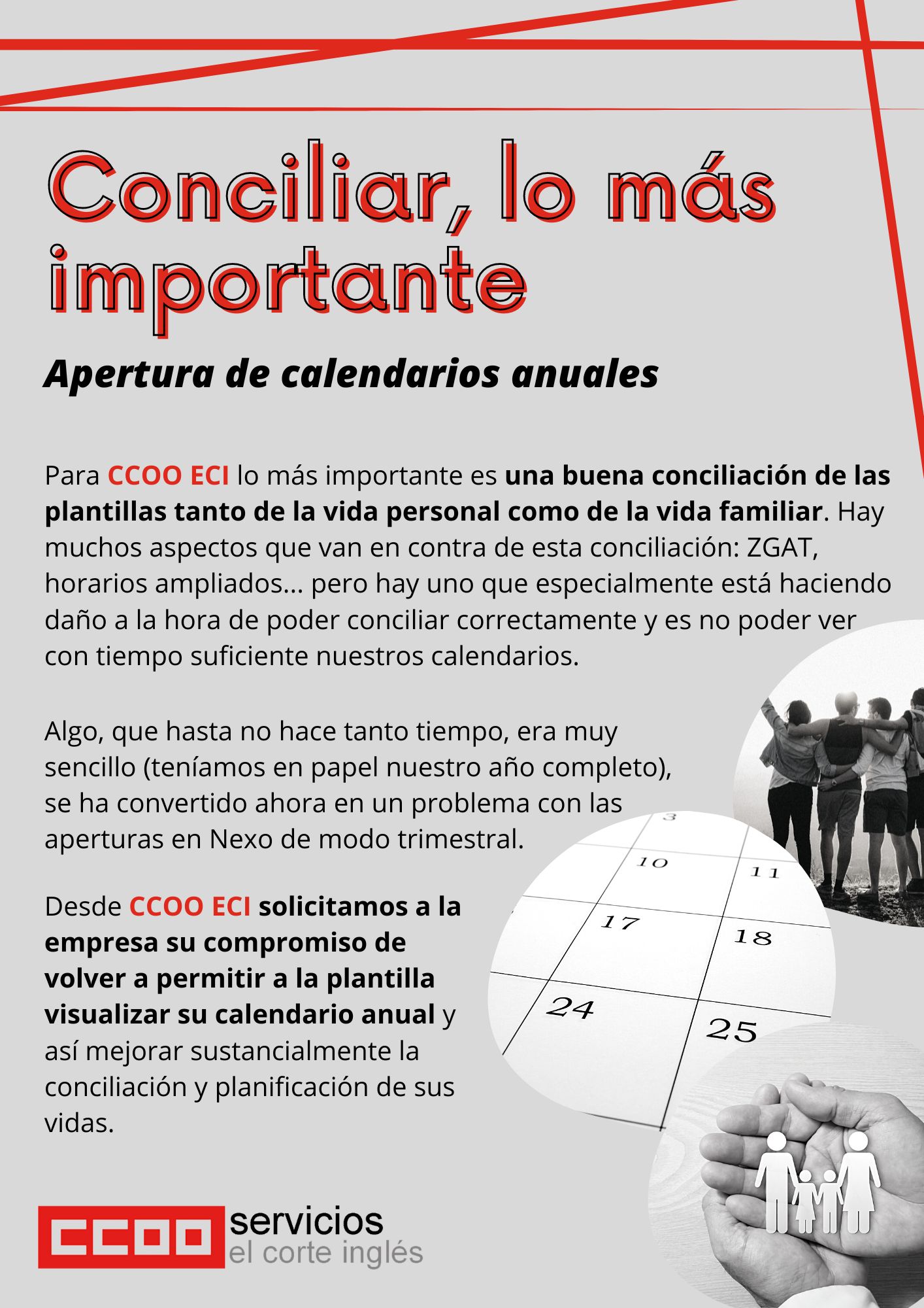 Desde CCOO ECI solicitamos a la empresa su compromiso de volver a permitir a la plantilla visualizar su calendario anual para mejorar su conciliación familiar y de su vida personal.
