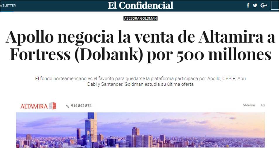 El Confidencial – Apollo negocia la venta de Altamira a Fortress (Dobank) por 500 millones