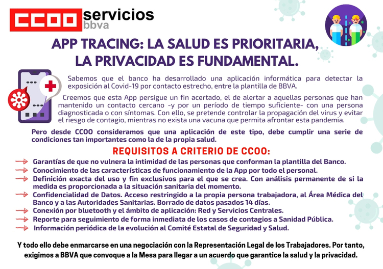 Sabemos que el banco ha desarrollado una aplicación informática para detectar la exposición al Covid-1 9 por contacto estrecho, entre la plantilla de BBVA. Pero desde CCOO consideramos que una aplicación de este tipo, debe cumplir una serie de condiciones tan importantes como la de la propia salud.