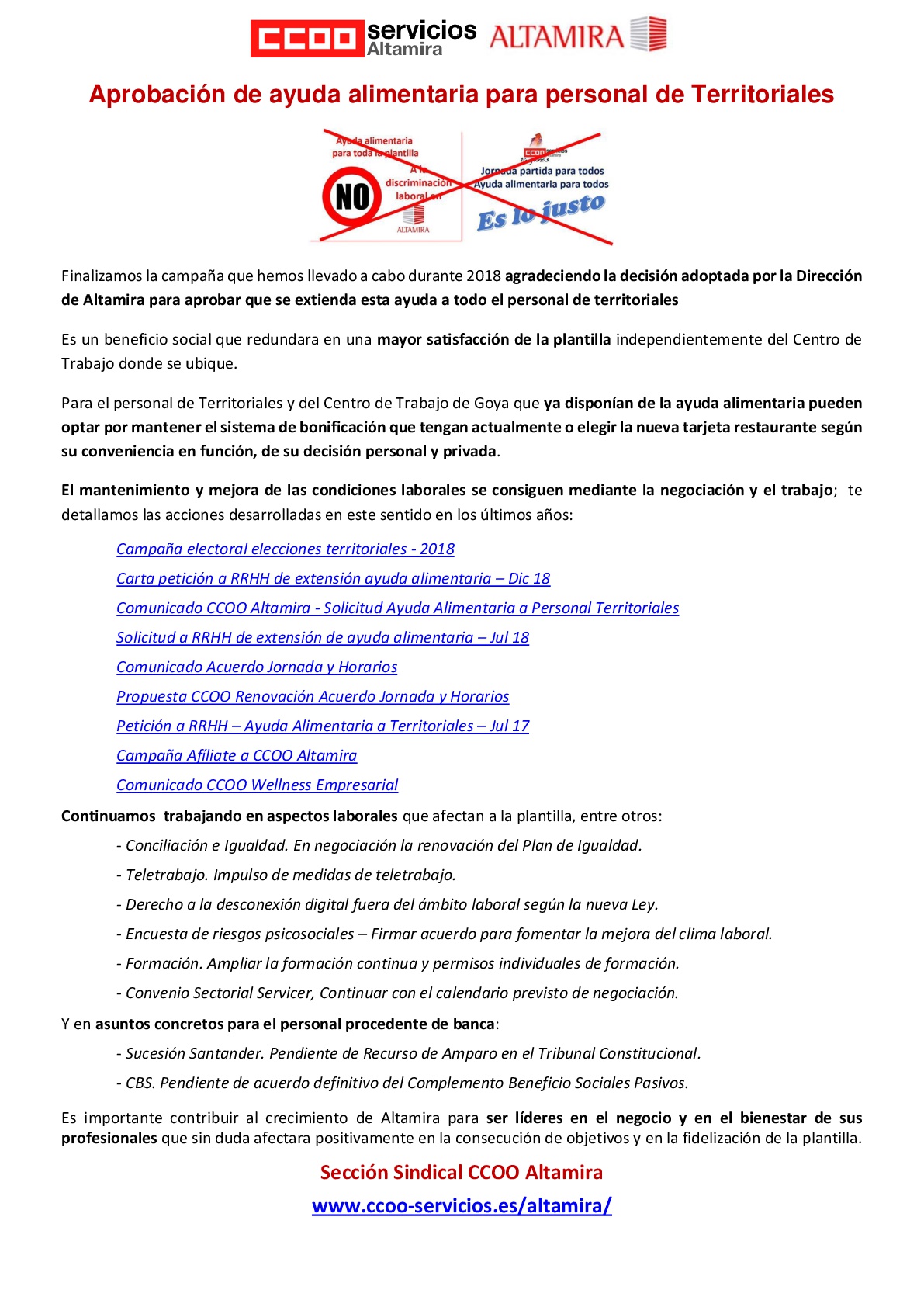 Finalizamos la campaña que hemos llevado a cabo durante 2018 agradeciendo la decisión adoptada por la Dirección de Altamira para aprobar que se extienda esta ayuda a todo el personal de territoriales