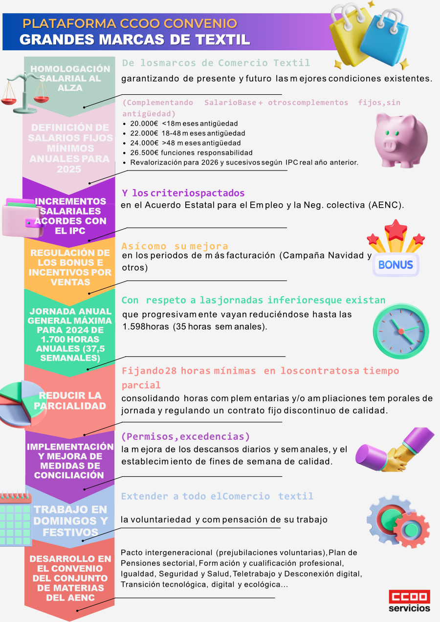 En la reunión de hoy del Convenio de Grandes Marcas de Textil, la patronal ARTE ha dado una primera respuesta a la Plataforma de CCOO, comprometiéndose a una mayor concreción por escrito, de forma previa a la próxima reunión, fijada para el 4/4/24.