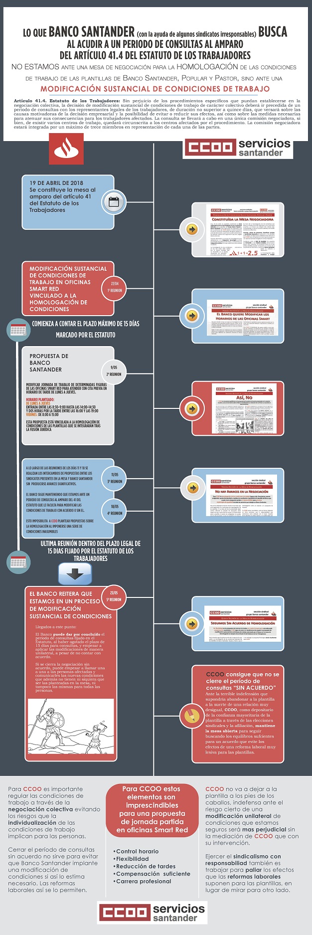 Adjuntamos infografía detallando y explicando el desarrollo de todo el proceso de negociación de la Homologación de las condiciones laborales de las plantillas Santander-Popular-Pastor, en la que el Banco Santander ha incluido la modificación del horario de las sucursales Smart Red.