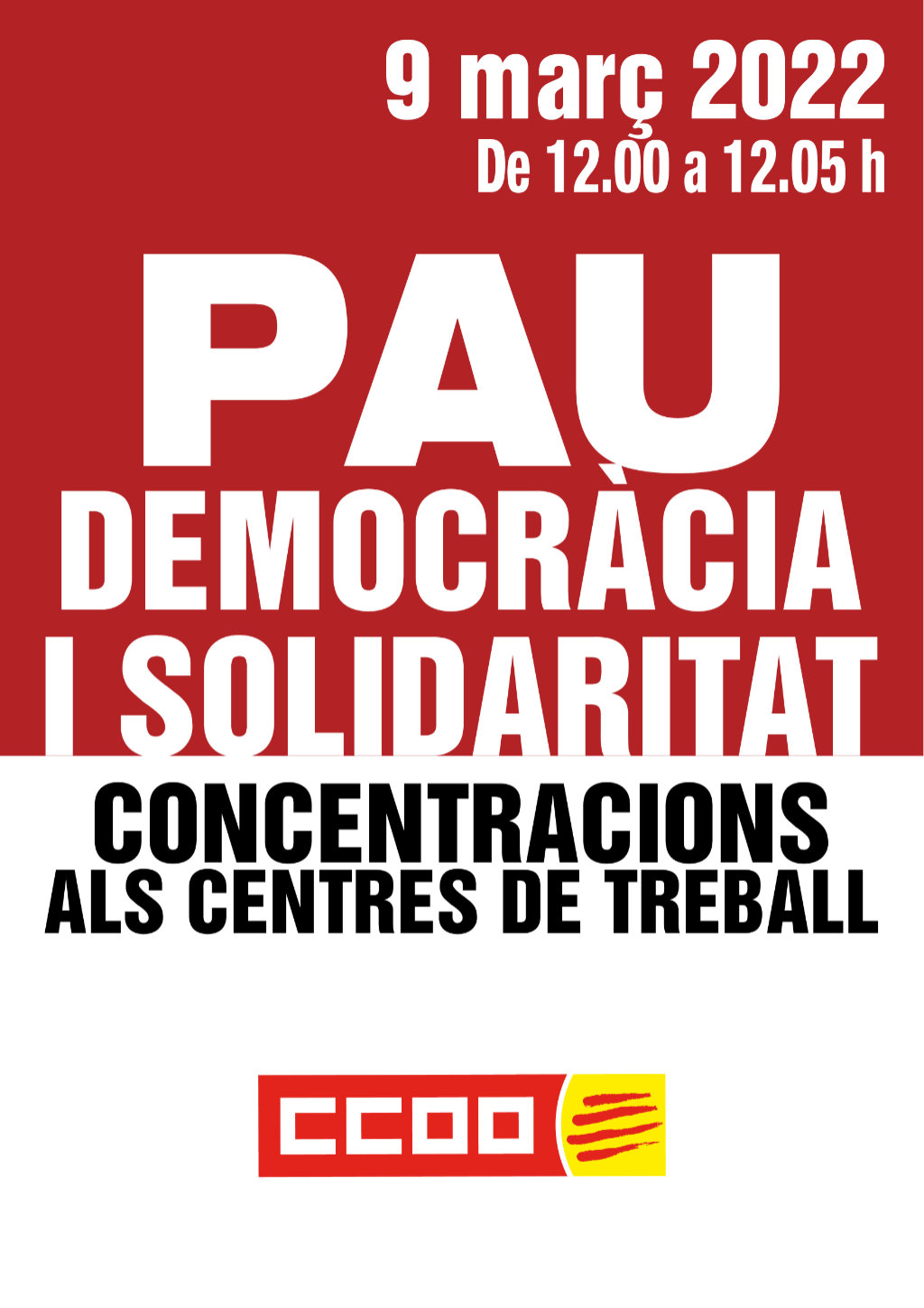 Fem, per tot això, una crida als i les treballadores de Catalunya que el DIMECRES 9 DE MARÇ es manifestin de manera silenciosa a l’entrada dels seus centres de treball de 12:00 a 12:05 hores, solidaritzant-nos així amb el poble de Ucraïna, demanant l’alto el foc i la immediata retirada de tropes russes del país.