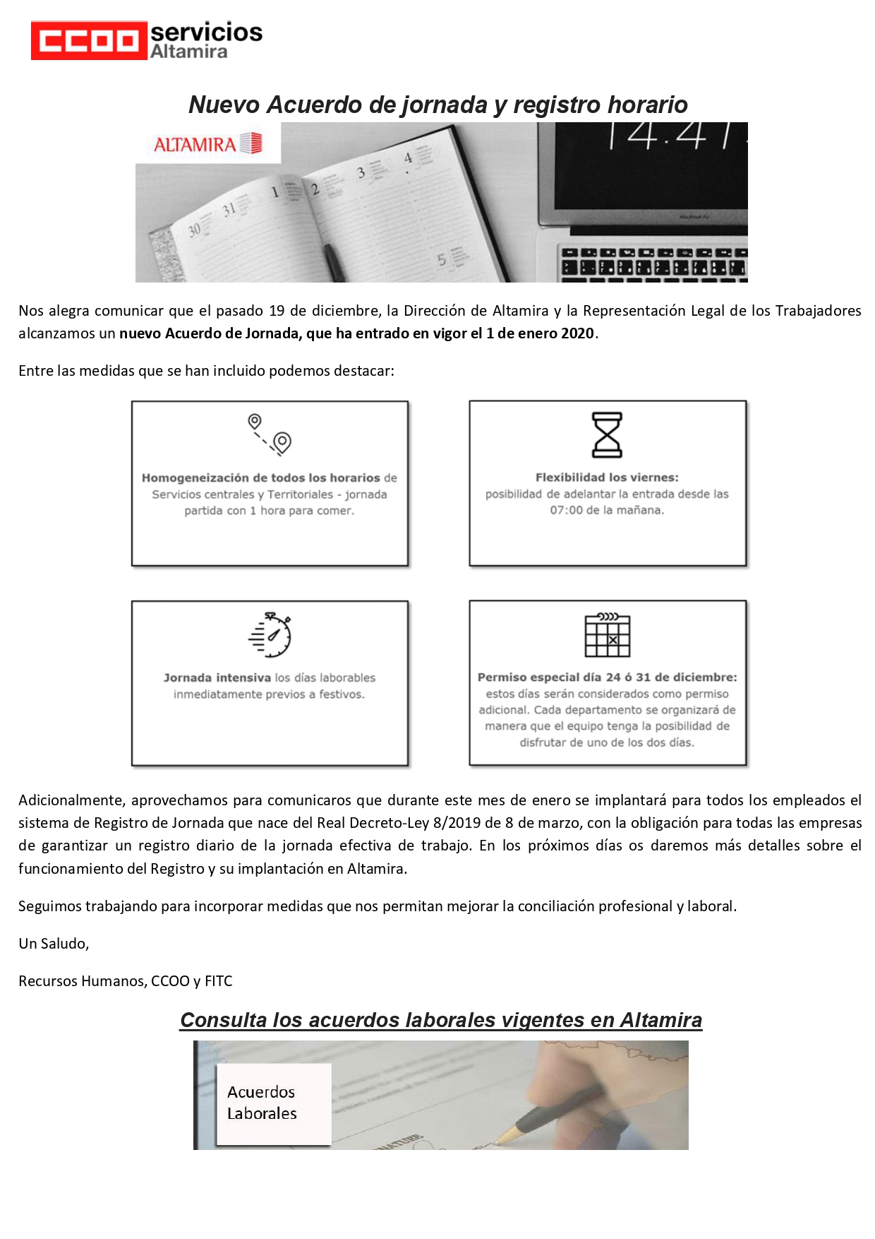 Nos alegra comunicar que el pasado 19 de diciembre, la Dirección de Altamira y la Representación Legal de los Trabajadores alcanzamos un nuevo Acuerdo de Jornada, que ha entrado en vigor el 1 de enero 2020.