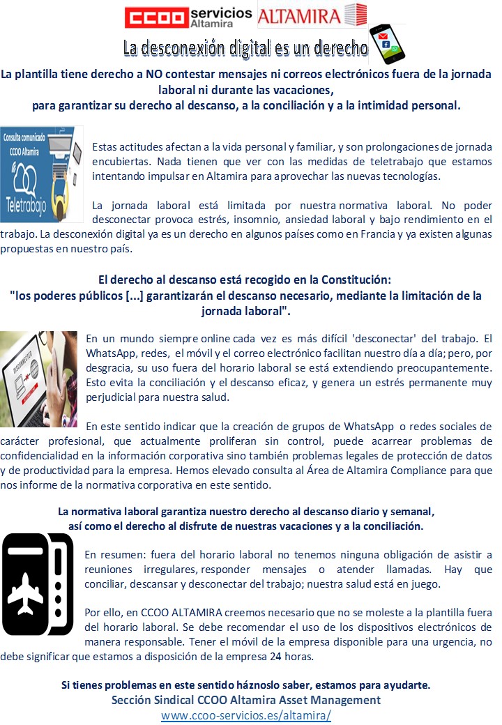 La plantilla tiene derecho a NO contestar mensajes ni correos electrónicos fuera de la jornada laboral ni durante las vacaciones,para garantizar su derecho al descanso, a la conciliación y a la intimidad personal.