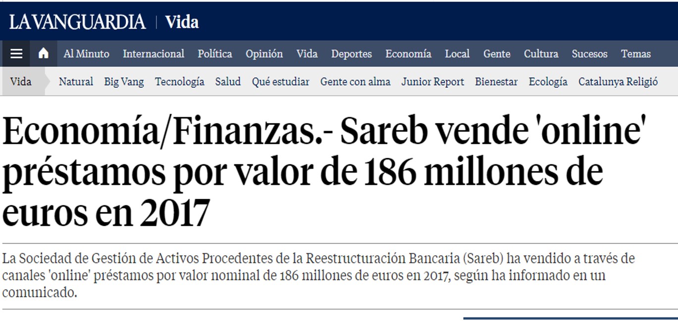 Sareb vende ‘online’ préstamos por valor de 186 millones de euros en 2017