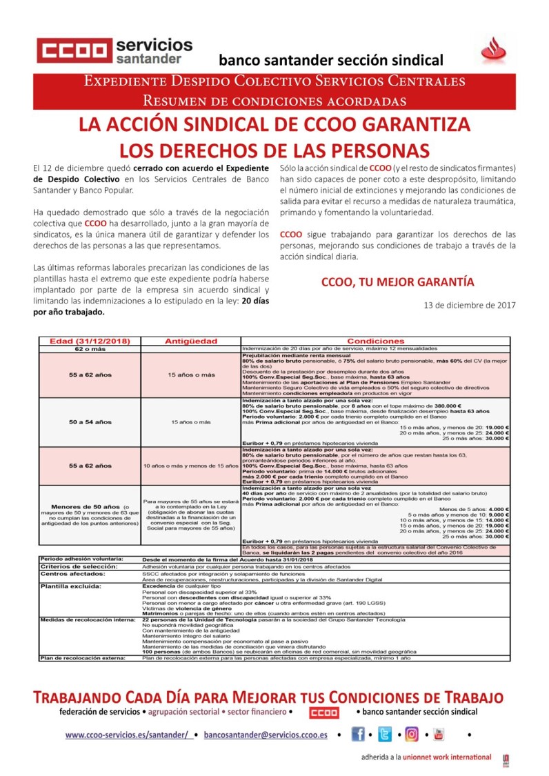 Hoy, 12 de diciembre, con la firma de CCOO, FITC, UGT y STS en el Acta de Acuerdo final, concluyen las negociaciones del Expediente de Despido Colectivo en Servicios Centrales de B. Santander y B, Popular.. La acción sindical ha conseguido modificar de manera significativa los planteamientos de salida de B. Santander, reduciendo de manera muy importante la cifra inicial de extinciones planteadas y mejorando las condiciones para garantizar las adhesiones voluntarias al acuerdo.