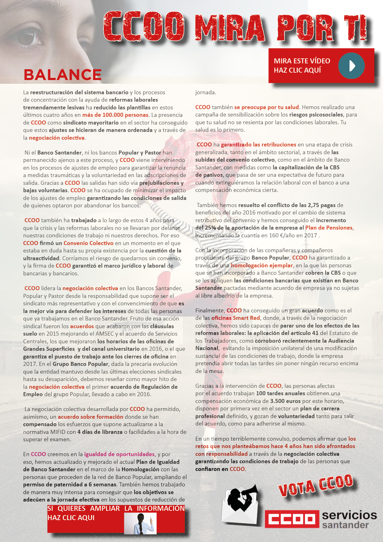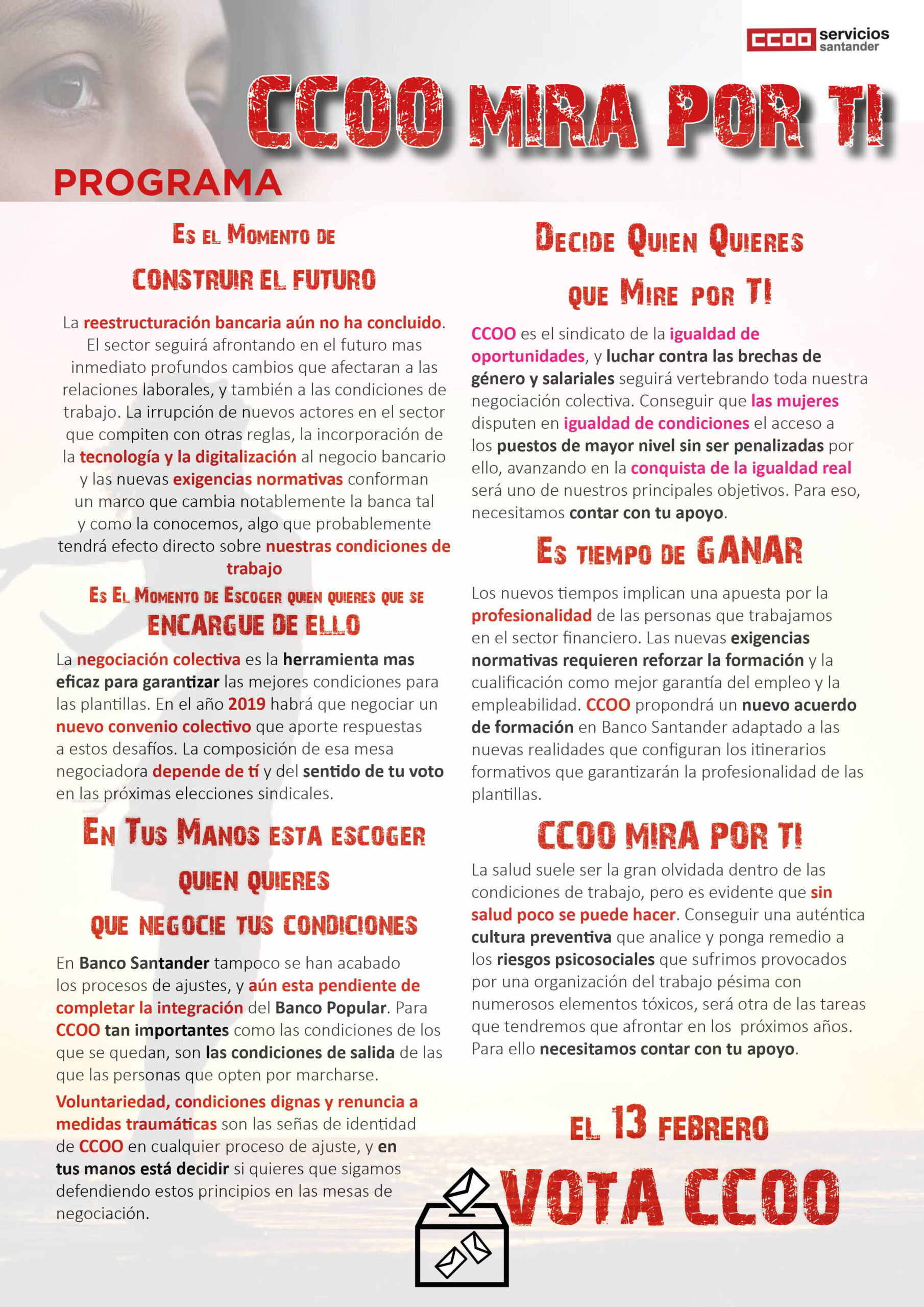 CCOO se presenta a esta cita con un balance plagado de acción sindical en un tiempo terriblemente convulso con el sector en constante reconversión. Y vuelve a pedir el respaldo de la plantilla para seguir haciendo lo que mejor sabe hacer: MIRAR POR LAS PERSONAS QUE TRABAJAMOS EN BANCO SANTANDER.