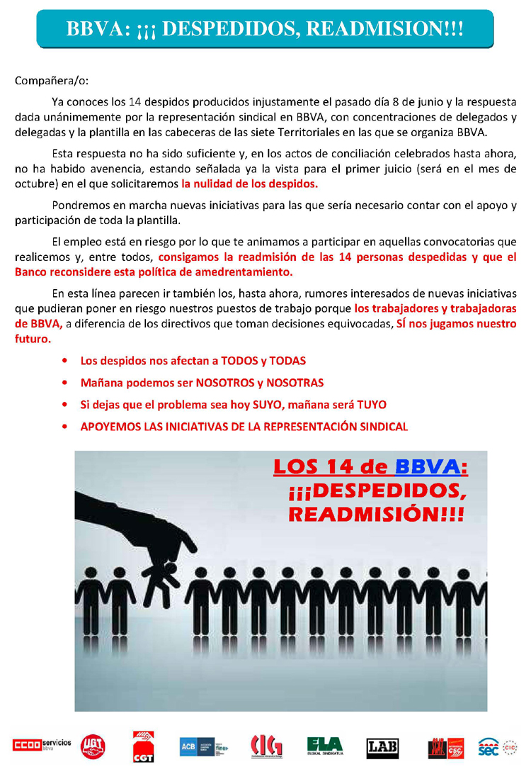 Ya conoces los 14 despidos producidos injustamente el pasado día 8 de junio y la respuesta dada unánimemente por la representación sindical en BBVA, con concentraciones de delegados y delegadas y la plantilla en las cabeceras de las siete Territoriales en las que se organiza BBVA.