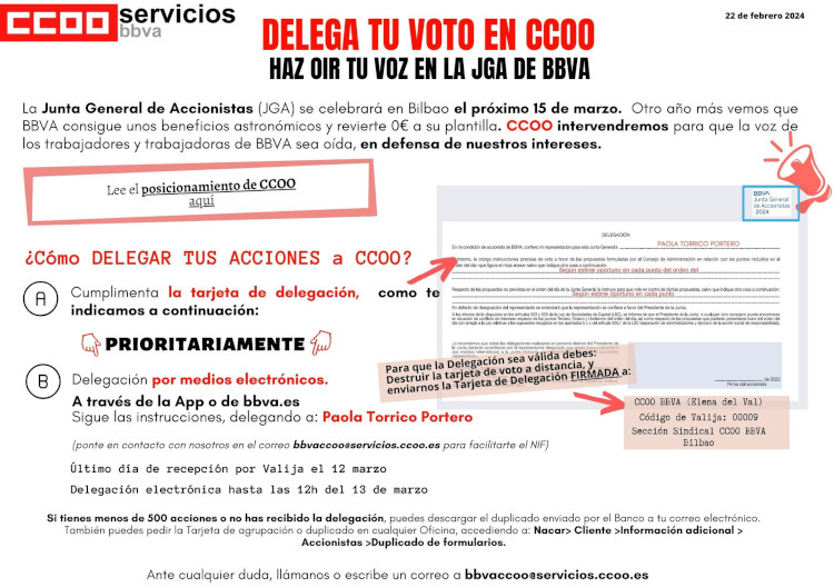 La Junta General de Accionistas (JGA) se celebrará en Bilbao el próximo 15 de marzo. Otro año más vemos que BBVA consigue unos beneficios astronómicos y revierte 0€ a su plantilla. CCOO intervendremos para que la voz de los trabajadores y trabajadoras de BBVA sea oída, en defensa de nuestros intereses.