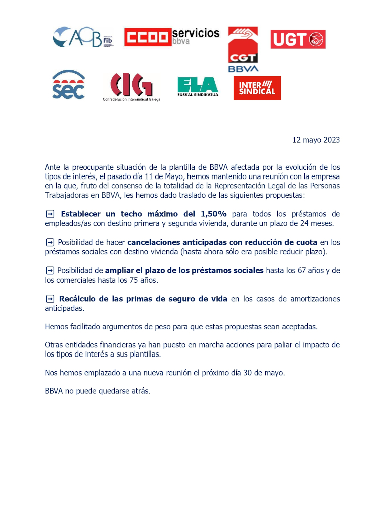 Tras la reunión mantenida el pasado 30 de mayo con la empresa, en relación con las condiciones de los préstamos hipotecarios, y ante la posición de unidad y fuerza que hemos mantenido la Representación Legal de las Personas Trabajadoras (RLPT), el pasado día 13 de junio, fuimos convocados por la empresa que nos planteó la siguiente propuesta: