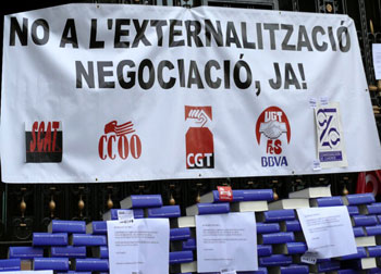 - CCOO, por otra parte, estamos impulsando un Convenio de Empresa en OP Plus. Ya sabemos que lo ideal es que tuviera el Convenio de Banca, para lo que en definitiva lo mejor es que se integrara en BBVA. Pero cuando más barato les salga, como ahora, más Dptºs externalizarán. Reclamamos un salario mínimo de 20.500 € (ahora son 15.000 €), jornada con salida los viernes y en Julio y Agosto a las 15 hs. (ahora trabajan todo el año 8 horas los cinco días de la semana), beneficios sociales, tarifas y condiciones crediticias BBVA, formación y desarrollo profesional y otras cuestiones.