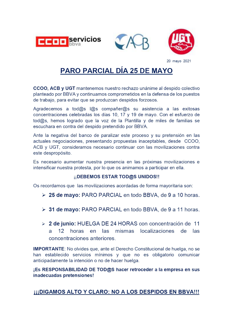 CCOO, ACB y UGT mantenemos nuestro rechazo unánime al despido colectivo planteado por BBVA y continuamos comprometidos en la defensa de los puestos de trabajo, para evitar que se produzcan despidos forzosos.