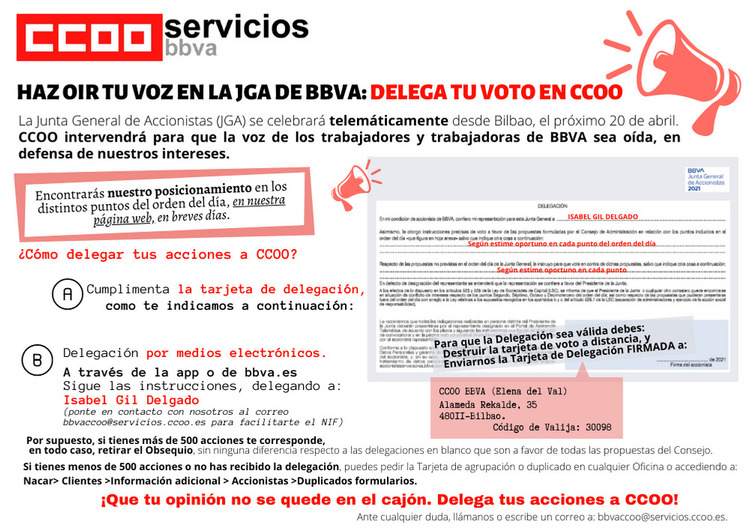 El próximo día 20 de abril tendrá lugar la JGA de BBVA. Os adjuntamos la información sobre el posicionamiento de CCOO el día de la JGA.