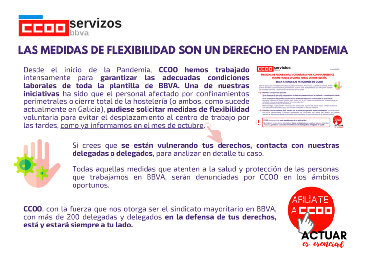Desde el inicio de la Pandemia, CCOO hemos trabajado intensamente para garantizar las adecuadas condiciones laborales de toda la plantilla de BBVA.
