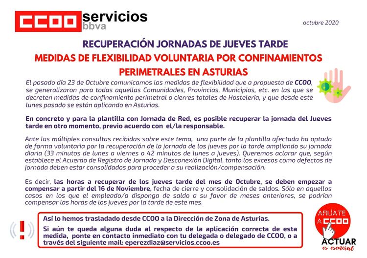 El pasado día 23 de Octubre comunicamos las medidas de flexibilidad que a propuesta de CCOO, se generalizaron para todas aquellas Comunidades, Provincias, Municipios, etc.. en las que se decreten medidas de confinamiento perimetral o cierres totales de Hostelería, y que desde este lunes pasado se están aplicando en Asturias.