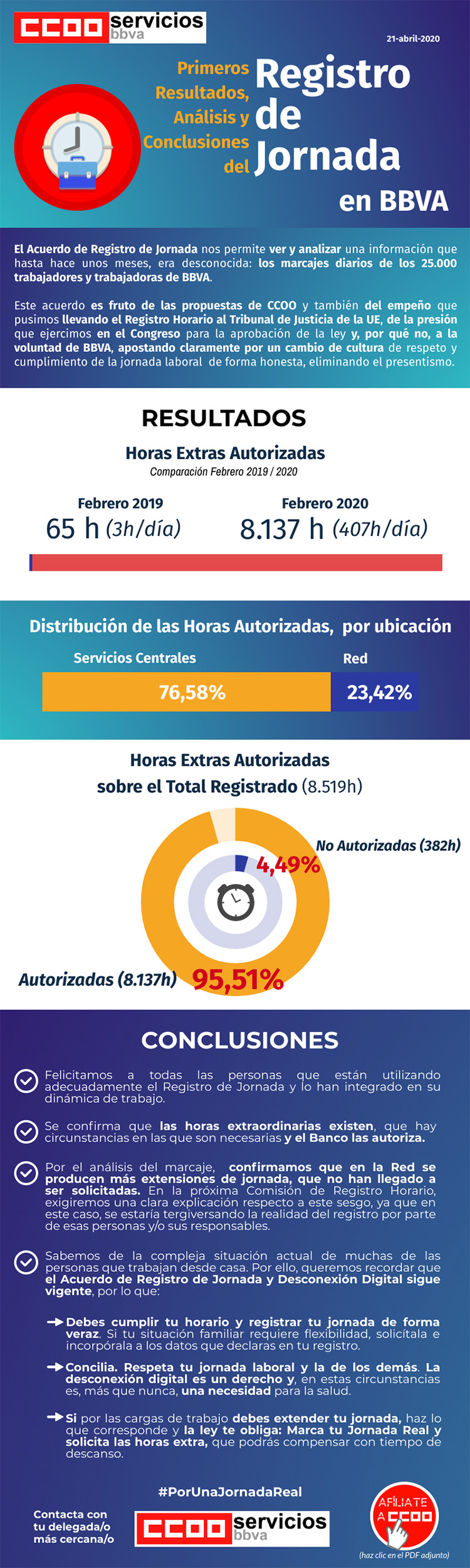 Este Acuerdo es fruto de las propuestas de CCOO y también del empeño que pusimos llevando el Resgistro Horario al Tribunal de Justícia de la UE, de la presión que ejercimos en el Congreso para la aprobación de la ley y, porqué no, de la voluntad de BBVA apostando claramente por un cambio de cultura, de respeto y cumplimiento de la jornada laboral de manera honesta, eliminando el presencialismo.