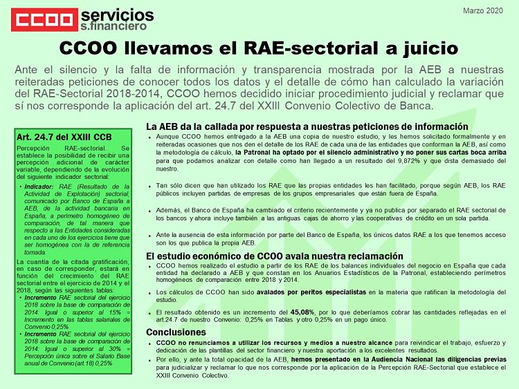 Ante el silencio y la falta de información y transparencia mostrada por la AEB a nuestras reiteradas peticiones de conocer todos los datos y el detalle de cómo han calculado la variación del RAE–Sectorial 2018–2014, CCOO hemos decidido iniciar procedimiento judicial.