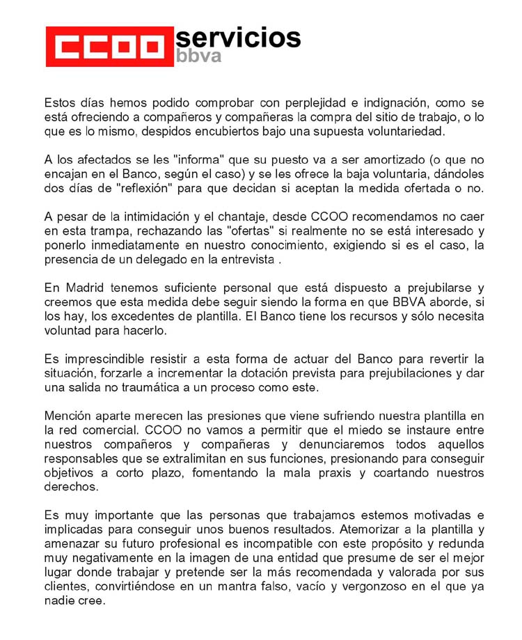 Estos días hemos podido comprobar con perplejidad e indignación, como se está ofreciendo a compañeros y compañeras la compra del sitio de trabajo, o lo que es lo mismo, despidos encubiertos bajo una supuesta voluntariedad.