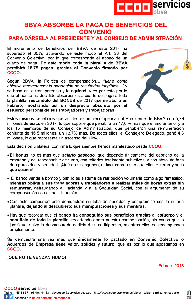 BBVA absorbe la Paga de Beneficios del Convenio