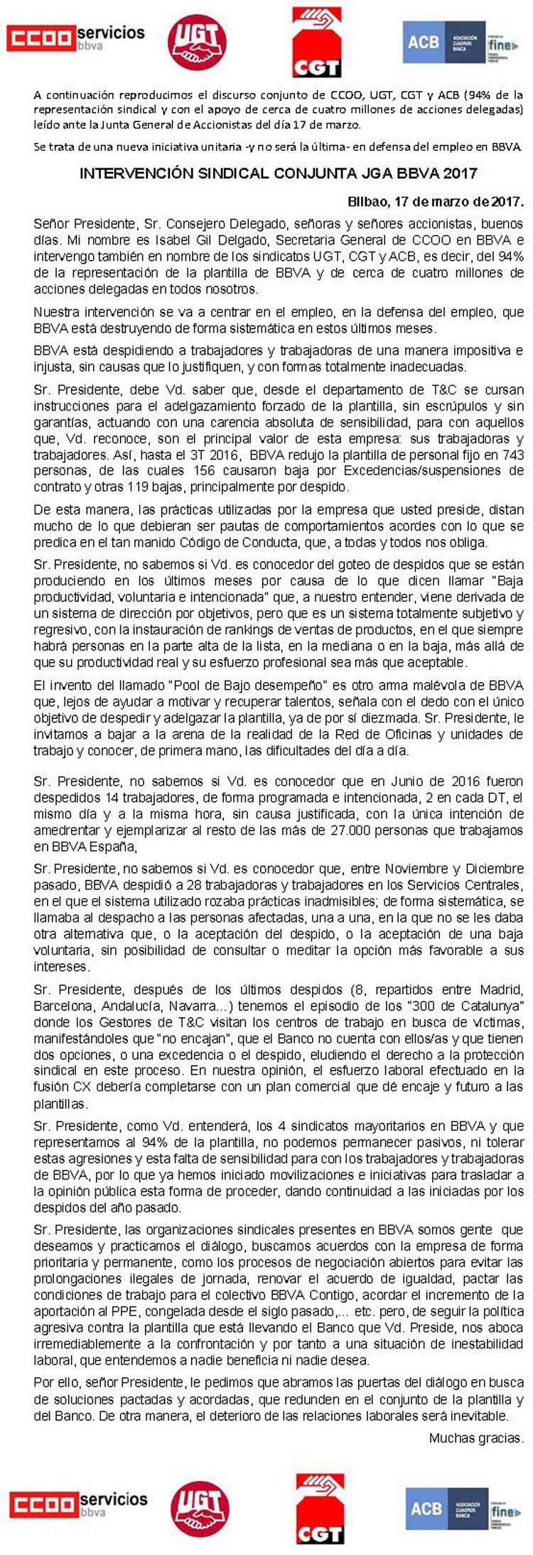 A continuación reproducimos el discurso conjunto de CCOO, UGT, CGT y ACB (94% de la representación sindical y con el apoyo de cerca de cuatro millones de acciones delegadas) leído ante la Junta General de Accionistas del día 17 de marzo. Se trata de una nueva iniciativa unitaria -y no será la última- en defensa del empleo en BBVA.leer Intervención Conjunta en pdf