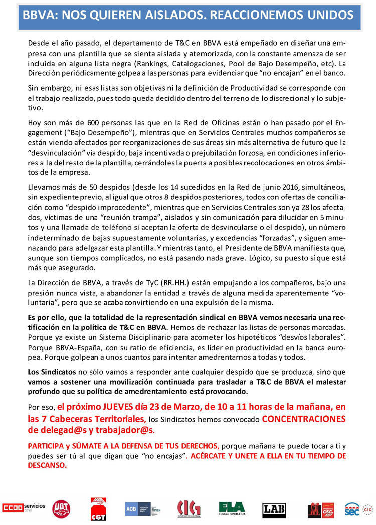 Los sindicatos presentes en BBVA y la participación de una parte de la plantilla, en sus quince minutos de descanso, nos hemos concentrado el pasado jueves, 23 de Marzo, ante las sedes de las 7 DTs de BBVA en protesta por el clima laboral de presión y amedrentamiento a la que BBVA pretende someter a la plantilla y contra los despidos injustos e indiscriminados que se están produciendo en estos últimos meses y el adelgazamiento de la plantilla en Catalunya de 300 empleados.