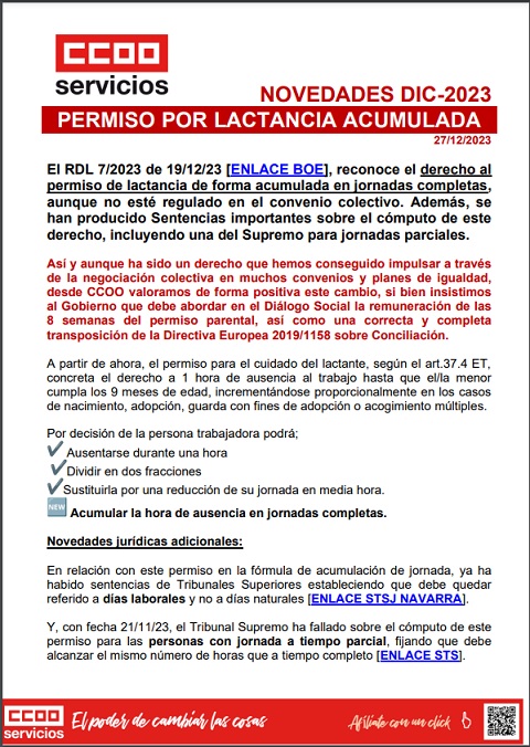 El RDL 7/2023 de 19/12/23, reconoce el derecho al permiso de lactancia de forma acumulada en jornadas completas, aunque no esté regulado en el convenio colectivo. Además, se han producido Sentencias importantes sobre el cómputo de este derecho, incluyendo una del Supremo para jornadas parciales.