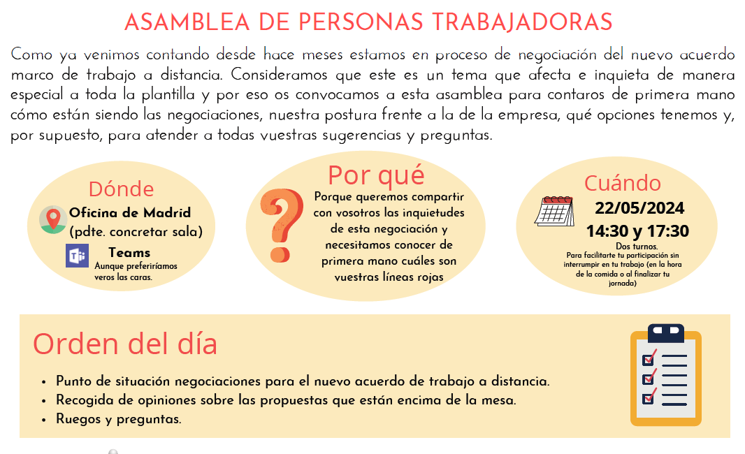 El próximo día 22 de mayo, os convocamos a una asamblea en 2 posibles turnos para hablar del futuro teletrabajo en nuestra empresa.