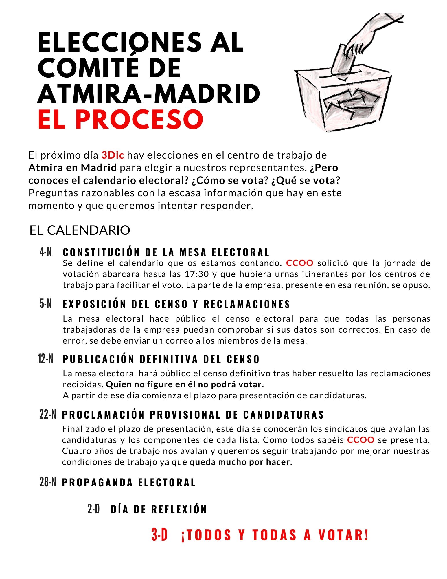 Pero miramos ahora al futuro. Hoy se ha establecido el calendario para las próximas elecciones al comité de Madrid. Será el día 3 de diciembre cuando volveremos a elegir a nuestros representantes en Atmira-Madrid. Elegiremos a quienes deberán seguir mejorando nuestras condiciones de trabajo en los 4 próximos años… Y ahí queremos estar.