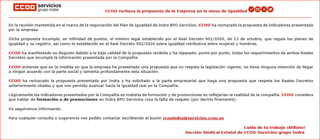 CCOO rechaza y lamenta profundamente esta decisión que va a aumentar la probabilidad de que las personas que trabajamos en Indra y sus familiares enfermemos y en el peor de los casos fallezcamos.