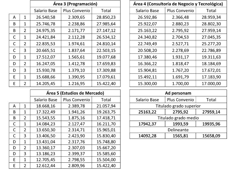 Estas parten del salario mínimo para la categoría más baja de cada área (excepto en el área 4) e incluyen, también, el diferencial de al menos 80€ entre cada categoría profesional actualizada y la inmediatamente superior.