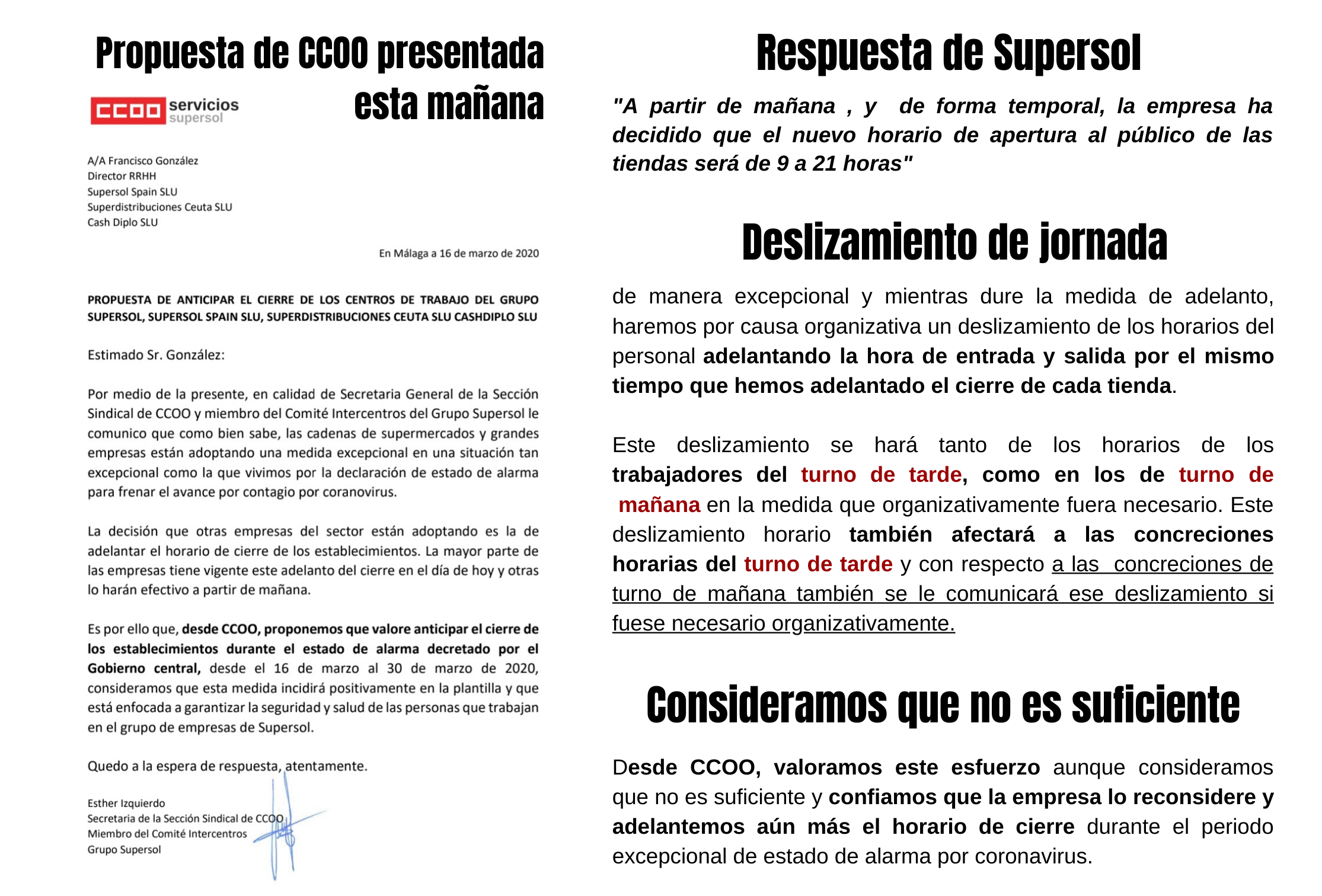 Por nuestra parte, os dejamos un enlace a la comunicación que trasladamos a la empresa el día 13 de marzo después de que el Presidente del Gobierno anunciara el estado de alarma en el que habíamos trasladado como CCOO las propuestas que consideramos son necesarias para garantizar la seguridad y salud de todas las personas que trabajan en las tiendas de Supersol. Por lo que valoramos positivamente las medidas adoptadas por la empresa ya que recogen las propuestas que hemos trasladado desde CCOO.