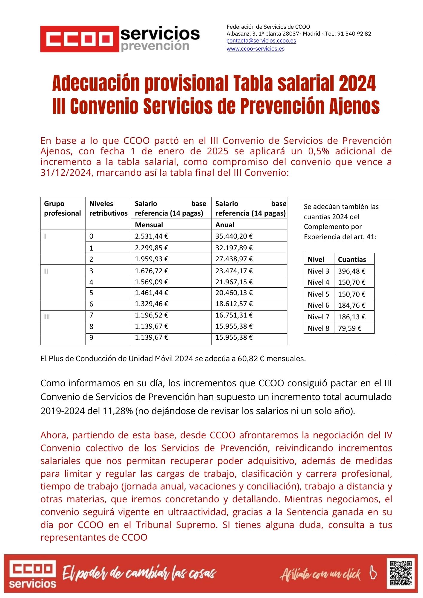 En base a lo que CCOO pactó en el III Convenio de Servicios de Prevención Ajenos, con fecha 1 de enero de 2025 se aplicará un 0,5% adicional de incremento a la tabla salarial, como compromiso del convenio que vence a 31/12/2024, marcando así la tabla final del III Convenio: