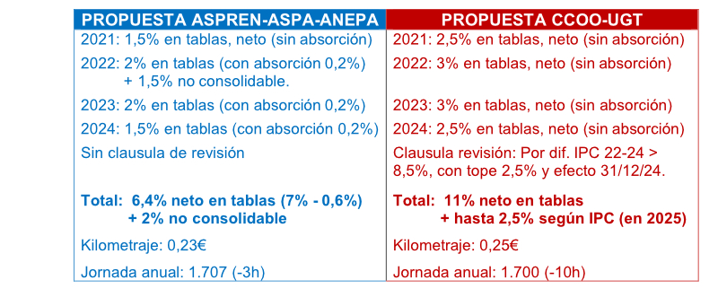 Hoy, tras un largo proceso de negociación y movilizaciones, CCOO y UGT hemos cerrado con ASPREN, ASPA y ANEPA en el SIMA un preacuerdo de Convenio que supone una actualización salarial con efectos retroactivos desde el 1/1/2021, abonando atrasos de 2021 y 2022, así como actualizando las tablas para 2023 en un 6,63% acumulado con respecto a las tablas actualmente de aplicación. La jornada máxima anual se reduce a 1.705 h y el kilometraje mínimo se actualiza a 24 céntimos.